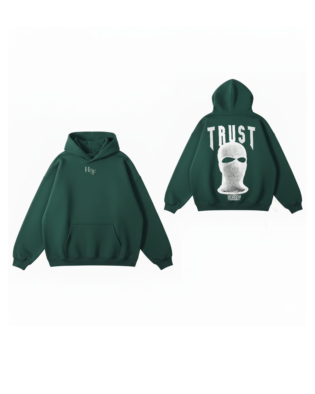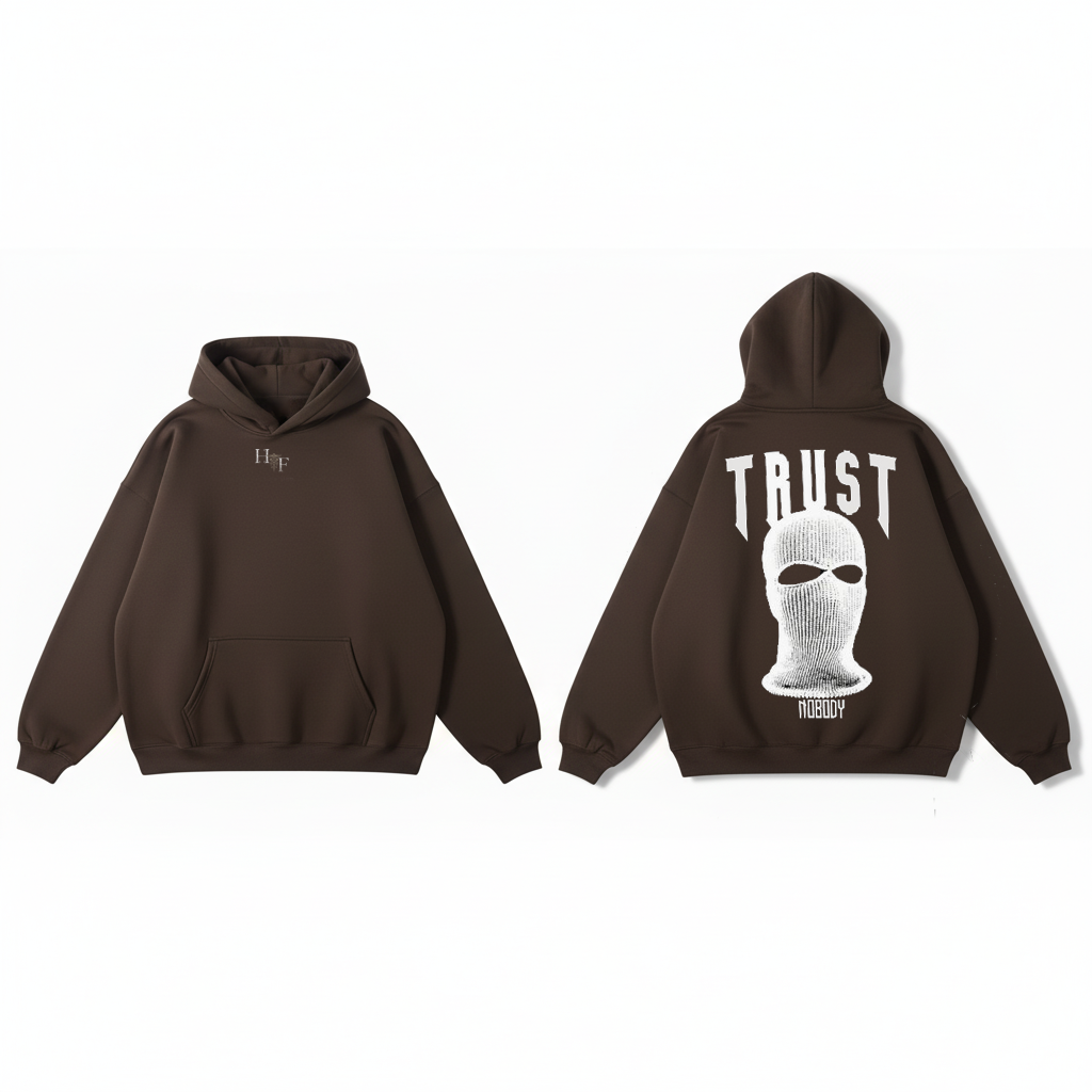 The front features a clean, minimal HF logo, while the back showcases a striking graphic of a knitted mask beneath the powerful statement “TRUST NOBODY.” The design blends mystery, confidence, and raw streetwear energy.